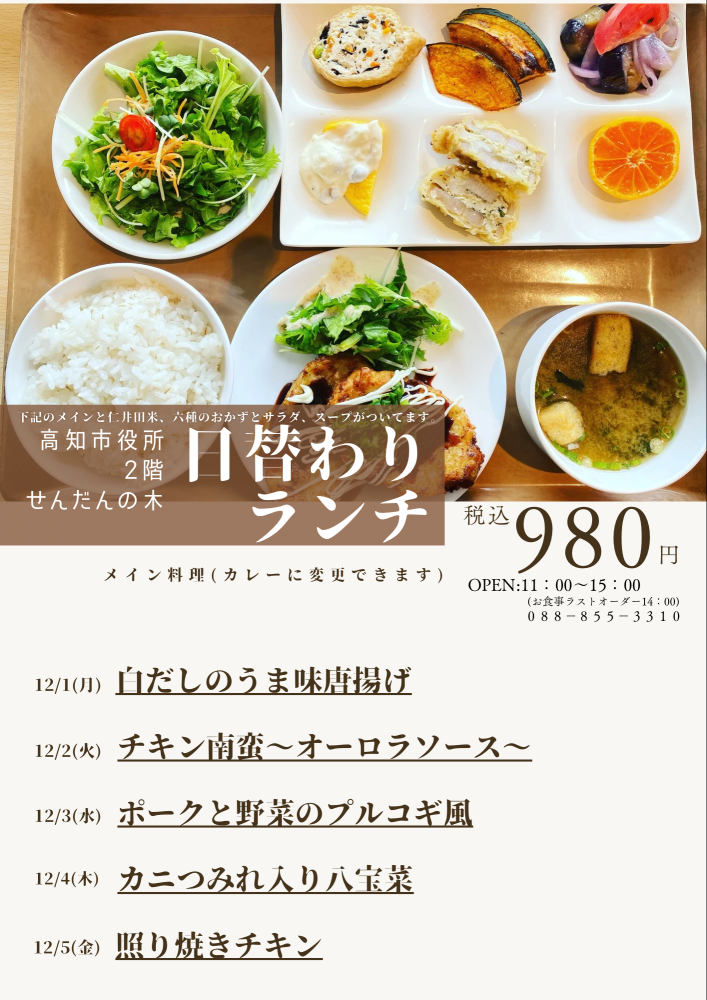 高知市役所2階「せんだんの木」では、来週もおいしいランチをご用意しています😊💛